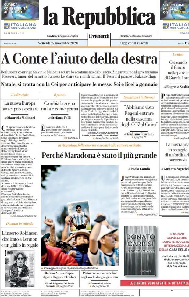 Prima Pagina, La Repubblica: “Maradona è stato il più grande, Buenos Aires e Napoli il gemellando del dolore”