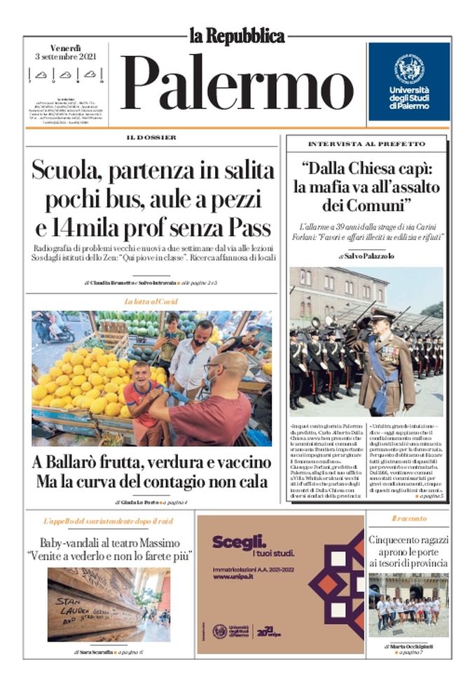 "Scuola, partenza in salita. Pochi bus, aule a pezzi e 14mila prof senza Pass". Apre così la Prima Pagina dell'edizione odierna del noto quotidiano "La Repubblica-Palermo". "Dalla Chiesa capì: la mafia va all'assalto dei Comuni". E ancora: "A Ballarò frutta, verdura e vaccino. Ma la curva del contagio non cala. Baby-vandali al teatro Massimo".