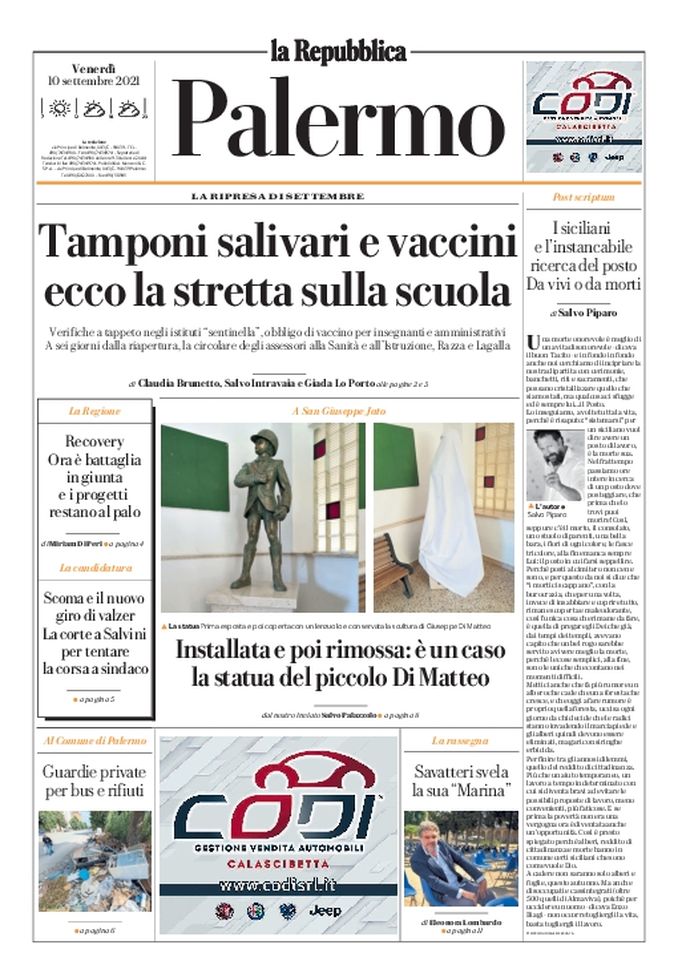 "Tamponi salivari e vaccini, ecco la stretta sulla scuola". Apre così la Prima Pagina dell'edizione odierna del noto quotidiano "La Repubblica-Palermo". "Installata e poi rimossa: è un caso la statua del piccolo Di Matteo". E ancora: "Guardie private per bus e rifiuti. I siciliani e l'instancabile ricerca del posto: da vivi o da morti".