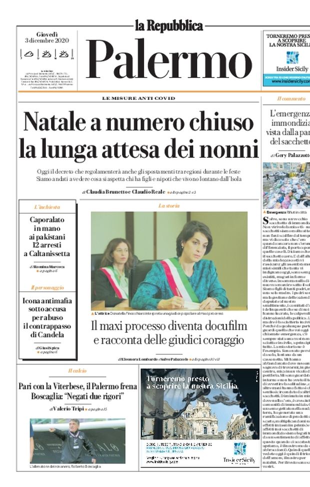Prima Pagina, La Repubblica-Palermo: “Natale a numero chiuso, la lunga attesa dei nonni. Il Palermo frena”