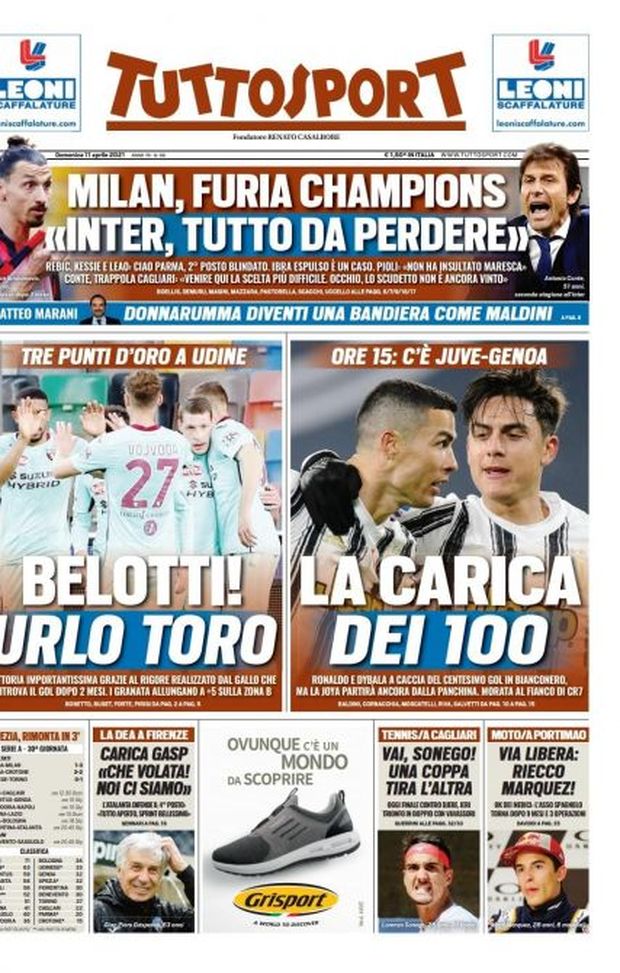 Prima Pagina, Tuttosport: “Belotti, urlo Toro. Juve-Genoa, la carica dei 100. Milan, furia Champions”