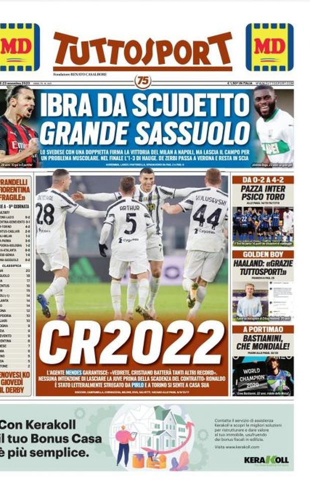 Apre così la prima pagina dell’edizione odierna di ‘Tuttosport’. “L’agente Mendes garantisce: ‘Vedrete, Cristiano batterà tanti altri record’. Nessuna intenzione di lasciare la Juve prima della scadenza del contratto: Ronaldo è stato letteralmente stregato da Pirlo e a Torino si sente a casa sua”. E ancora: “Pazza Inter, psico Toro”. In taglio alto: “Ibra da scudetto, grande Sassuolo. Lo svedese con una doppietta firma la vittoria del Milan a Napoli, ma lascia il campo per un problema muscolare. Nel finale l’1-3 di Hauge. De Zerbi passa a Verona e resta in scia”.