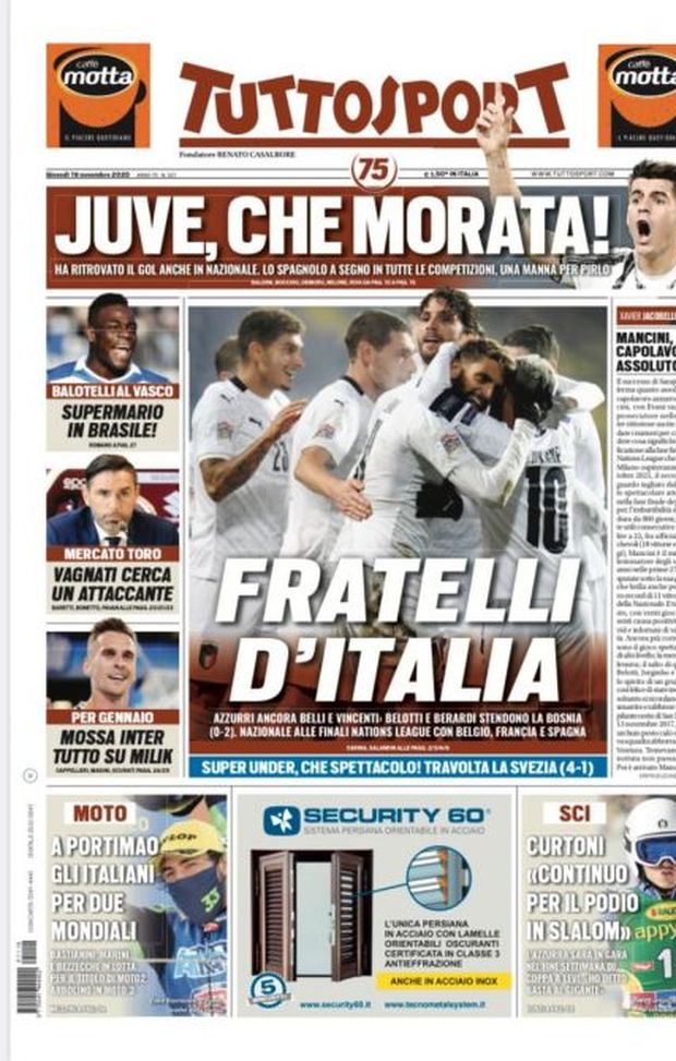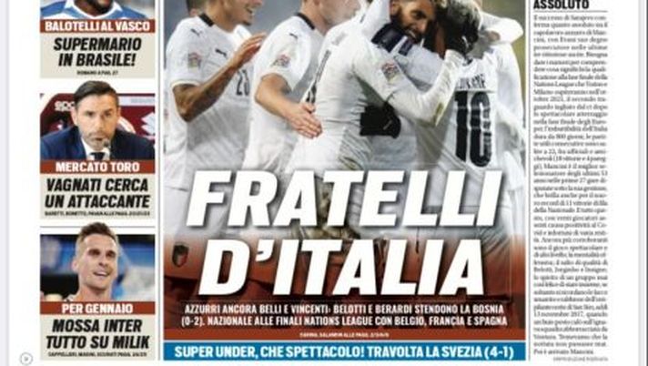 Apre così la prima pagina dell’edizione odierna di ‘Tuttosport’. “Azzurri ancora belli e vincenti: Belotti e Berardi stendono la Bosnia. Nazionale alle finali Nations League con Belgio, Francia e Spagna. Super Under, che spettacolo! Travolta la Svezia”. E ancora: “Balotelli al Vasco. SuperMario in Brasile! Mercato Toro: Vagnati cerca un attaccante. Per gennaio: mossa Inter, tutto su Milik”. Infine, in taglio alto: “Juve, che Morata! Ha ritrovato il gol anche in Nazionale. Lo spagnolo a segno in tutte le competizioni, una manna per Pirlo”.