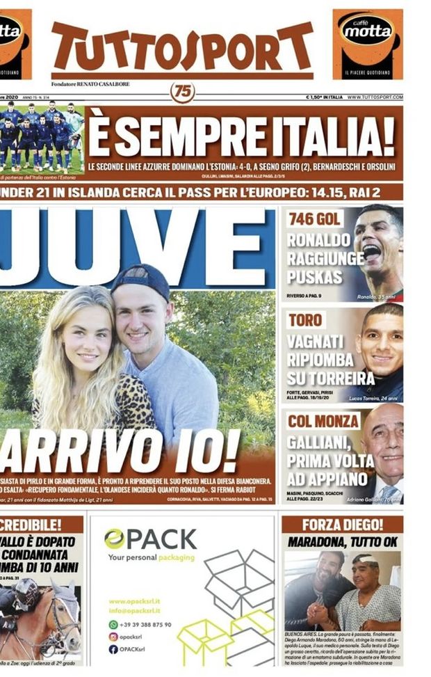 Apre così la prima pagina dell’edizione odierna di ‘Tuttosport’, oggi in edicola. “De Ligt, entusiasta di Pirlo e in grande forma. È pronto a riprendere il suo posto nella difesa bianconera. Brio lo esalta: ‘Recupero fondamentale, l’olandese inciderà quanto Ronaldo’. Si ferma Rabiot”. In taglio alto, riflettori puntati sulla nazionale italiana: “È sempre Italia! Le seconde linee azzurre dominano l’Estonia”. E ancora: “746 gol, Ronaldo raggiunge Puskas. Toro, Vagnati ripiomba su Torreira. Galliani, prima volta ad Appiano col Monza. Forza Diego! Maradona, tutto ok”.