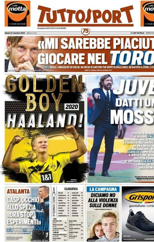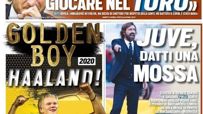 Apre così la prima pagina dell’edizione odierna di "Tuttosport" che incorona anche Haaland: "Golden Boy 2020 Haaland!". In taglio alto la dichiarazione di Francesco Totti: "Mi sarebbe piaciuto giocare nel Toro". In taglio basso: 'Gasp occhio allo Spezia': "Ora stop esperimenti".