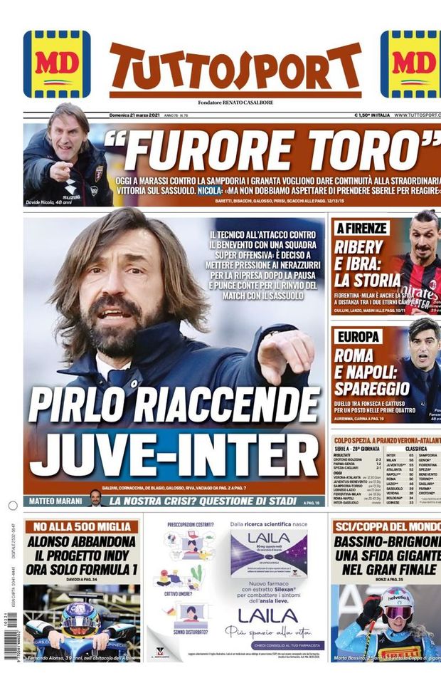 Prima Pagina, Tuttosport: “Pirlo riaccende Juve-Inter. Ribery e Ibra, la storia. Furore Toro”