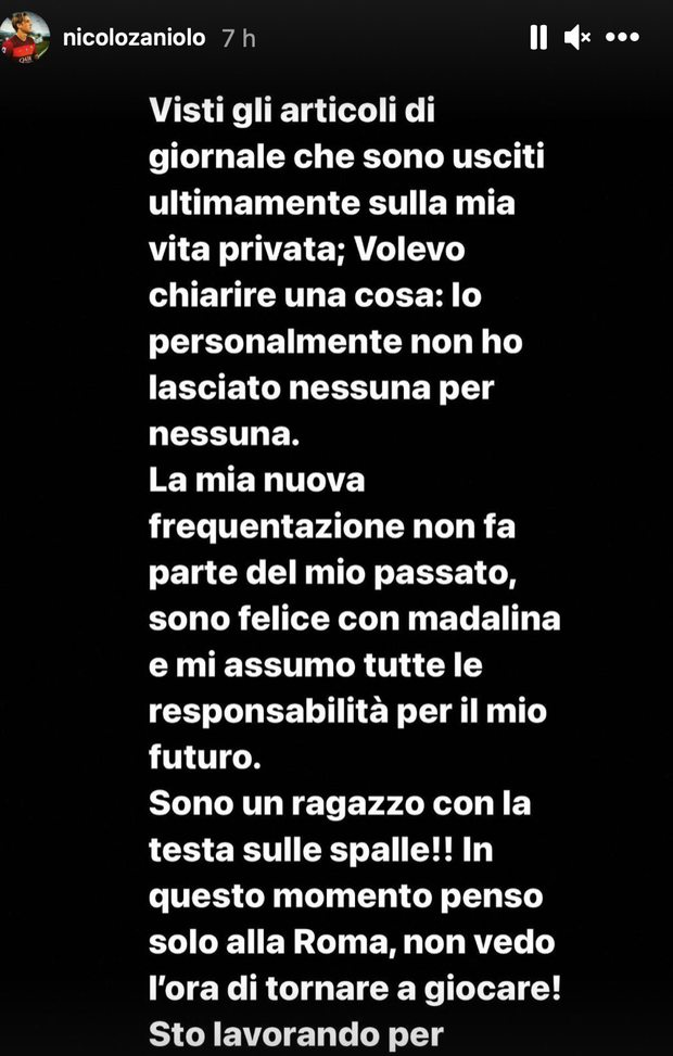 "Visti gli articoli di giornale che sono usciti ultimamente sulla mia vita privata. Volevo chiarire una cosa: io personalmente non ho lasciato nessuna per nessuna. La mia nuova frequentazione non fa parte del mio passato, sono felice con Madalina e mi assumo tutte le responsabilità per il mio futuro. Sono un ragazzo con la testa sulle spalle!! In questo momento penso solo alla Roma, non vedo l'ora di tornare a giocare! Sto lavorando per tornare il più in forma possibile".