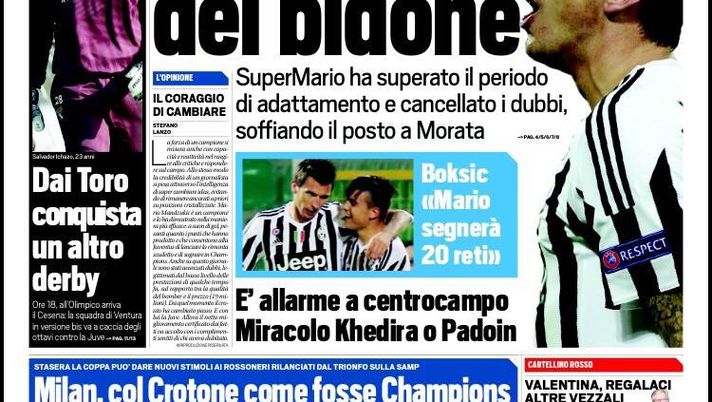 "Alla faccia del bidone. Mandzukic si è preso la Juve con i gol. SuperMario ha superato il periodo di adattamento e cancellato i dubbi, soffiando il posto a Morata". Titola così l'edizione odierna di 'Tuttosport'. "Boksic: 'Mario segnerà 20 reti'. E' allarme a centrocampo, miracolo Khedira o Padoin - si legge in prima pagina -. Napul'è primo! Strepitoso Higuain: piegata l'Inter (2-1) ridotta in 10 dall'espulsione di Nagatomo. Ma nei minuti finali la squadra di Sarri trema. Frenata viola sul campo del Sassuolo: 1-1. Milan, col Crotone come fosse Champions. Stasera la coppa può dare nuovi stimoli ai rossoneri rilanciati dal trionfo sulla Samp. Valzer allenatori. Mandorlini, ciao Verona. Adesso c'è Corini in pole".