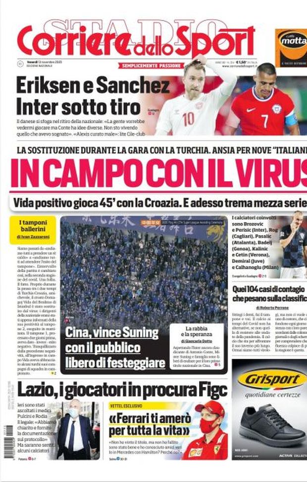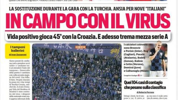 Apre così la prima pagina dell’edizione odierna del “Corriere dello Sport”. “Vida positivo gioca 45’ con la Croazia. E adesso trema mezza Serie A. La sostituzione durante la gara con la Turchia. Ansia per nove “italiani”. I calciatori coinvolti sono Brozovic e Perisic (Inter), Rog (Cagliari), Pasalic (Atalanta), Badelj (Genoa), Kalinic e Cetin (Verona), Demiral (Juve) e Calhanoglu (Milan). Cina, vince Suning con il pubblico libero di festeggiare”. In taglio alto: “Eriksen e Sanchez, Inter sotto tiro. Il danese si sfoga nel ritiro della nazionale: ‘La gente vorrebbe vedermi giocare ma Conte ha idee diverse. Non sto vivendo quello che avevo sognato’. ‘Alexis curato male’: lite Cile-club”. Infine, in taglio basso: “Lazio, i giocatori in procura Figc”.