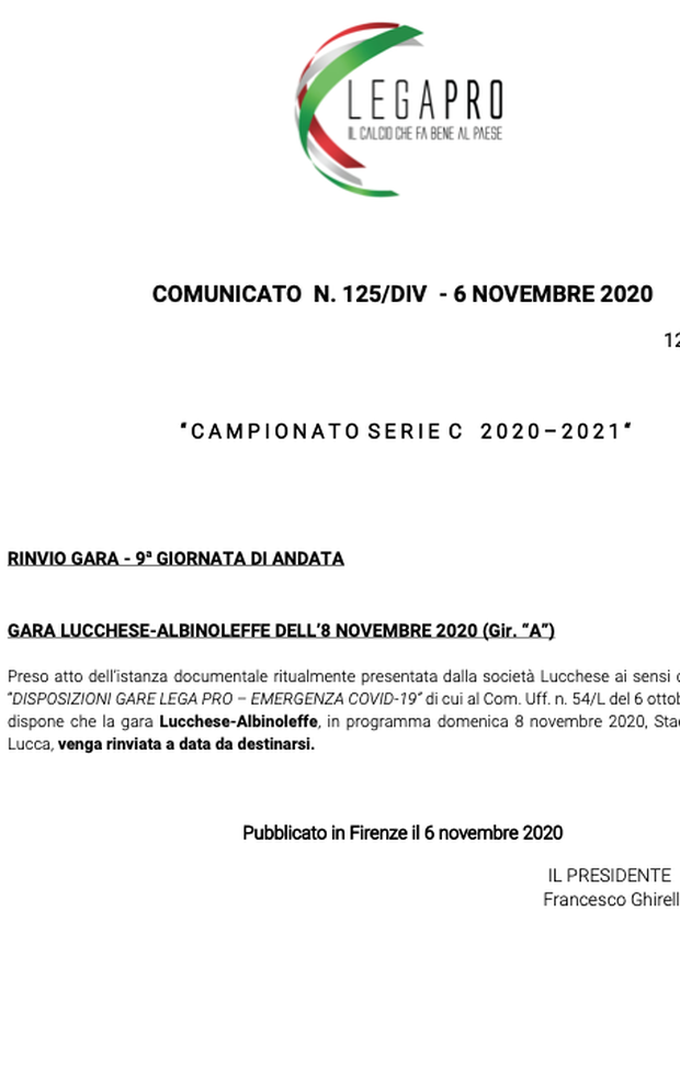 IL COMUNICATO DELLA LEGA PRO - "Preso atto dell’istanza documentale ritualmente presentata dalla società Lucchese ai sensi del punto 4 delle “DISPOSIZIONI GARE LEGA PRO – EMERGENZA COVID-19” di cui al Com. Uff. n. 54/L del 6 ottobre 2020, la Lega dispone che la gara Lucchese-Albinoleffe, in programma domenica 8 novembre 2020, Stadio “Porta Elisa”, Lucca, venga rinviata a data da destinarsi".