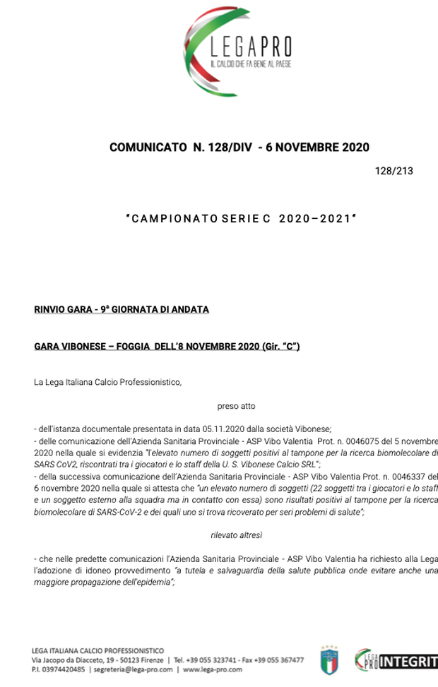 La Lega Pro dispone il rinvio di Vibonese-Foggia causa Covid-19