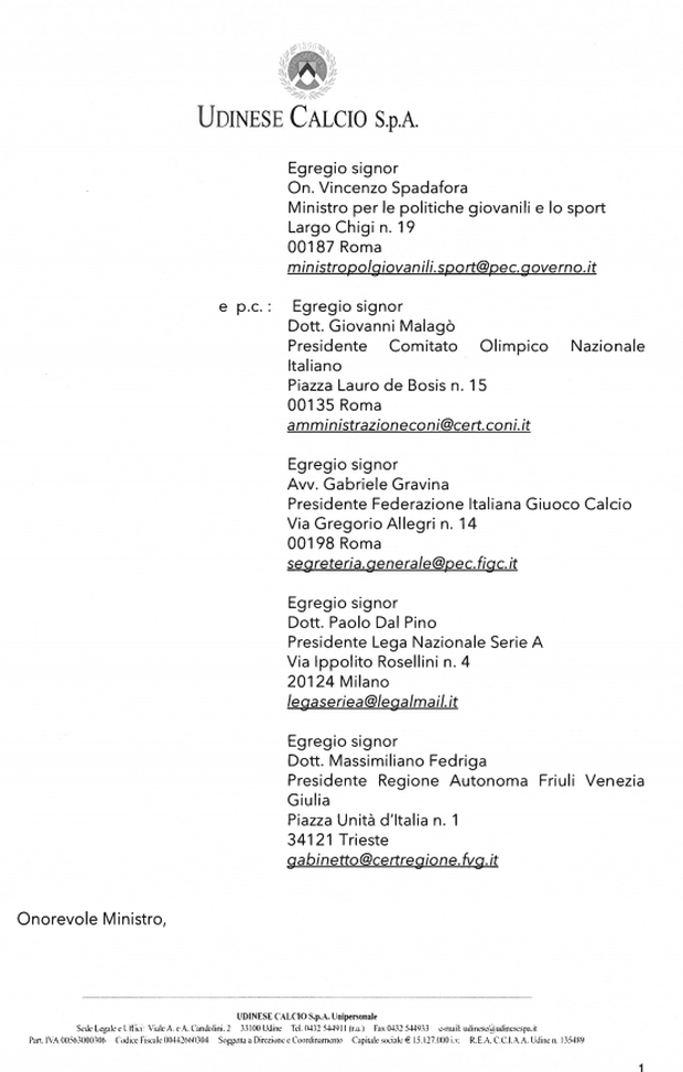 "In relazione alla lettera inviata dal Patron Gianpaolo Pozzo al Ministro delle Politiche Giovanili e dello Sport, on. Vincenzo Spadafora e, per conoscenza, al Presidente del Coni Giovanni Malagò, al Presidente della Figc Gabriele Gravina, al Presidente della Lega Serie A Paolo Dal Pino e al Presidente della Regione Friuli Venezia Giulia Massimiliano Fedriga, per evitare ogni tipo di strumentalizzazione e speculazione, ne pubblichiamo, di seguito, il testo", si legge sul sito ufficiale del club bianconero.